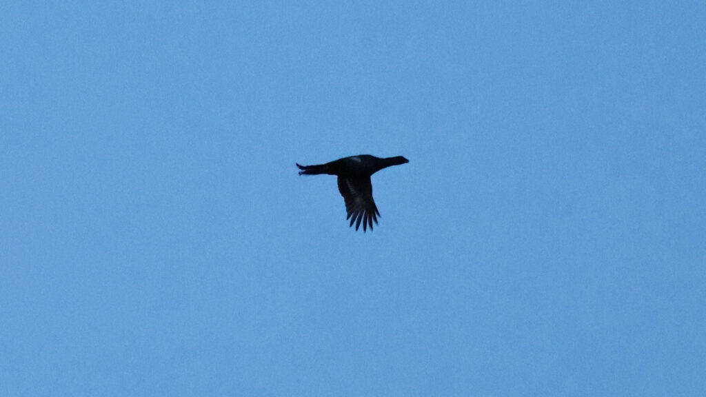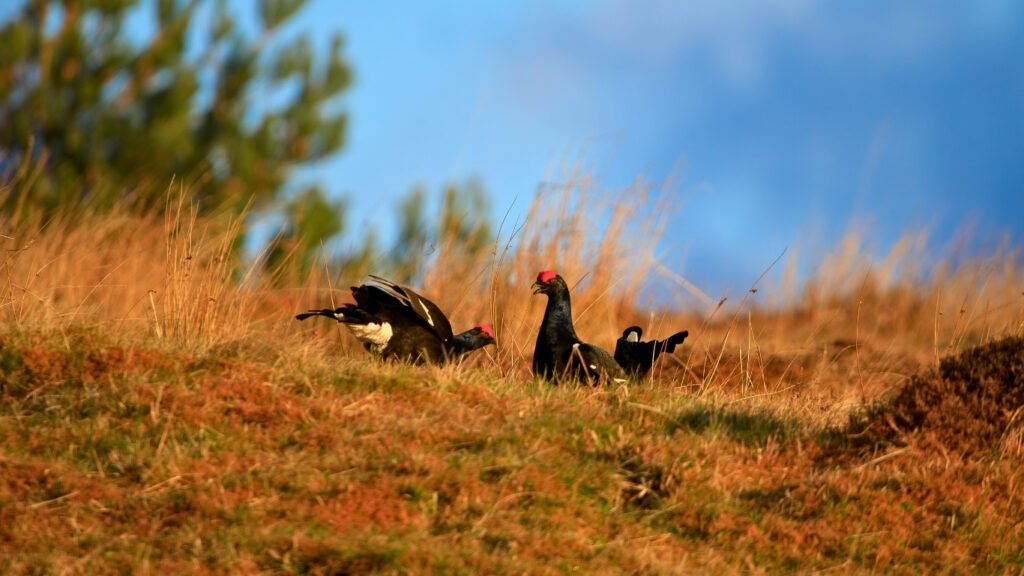 As we edge further up the track, the birds see us before we see them—two black grouse suddenly take flight, skimming the horizon with fast-flapping wings and white tails, calling all the way. In the cool air of the glen, we observe the lek from which they took flight. Eight birds remain on the grass, feeding and interacting socially. They take flight again and settle in a birch tree, clinging to branches that seem too spindly to support them, yet they are as at home in the tree as on the grass or in the air.